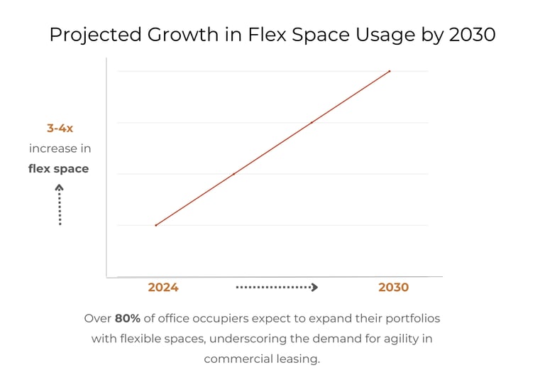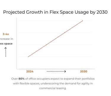 A recent survey by Colliers indicates that over 80% of office occupiers plan to expand their commercial portfolios through flexible spaces in the coming years. This expansion is anticipated to be most pronounced among multinational companies, with projections of a 3-4x increase in flex space usage by 2030.